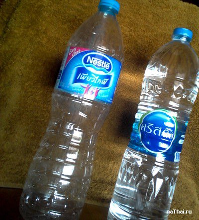 Вода на Самуи бесплатная. В домах в основном добывается со скважин. Дожди на Самуи на сопках частенько, поэтому вода круглый год. Можно ли пить воду из крана? Ну в разных местах по разному. Налейте в стакан, посмотрите на ее прозрачность, подержите два дня и понюхайте. Если тухлой не пахнет, значит вашу воду из крана пить можно. Но все же лучше ее отстаивать пару дней в ведрах, а потом закипятить. В магазинах большой выбор воды разных производителей, но по моему опыту скажу, что в 2014 году лучше брать эту воду. Вот смотрите как выглядит бутылка. Почему ее?