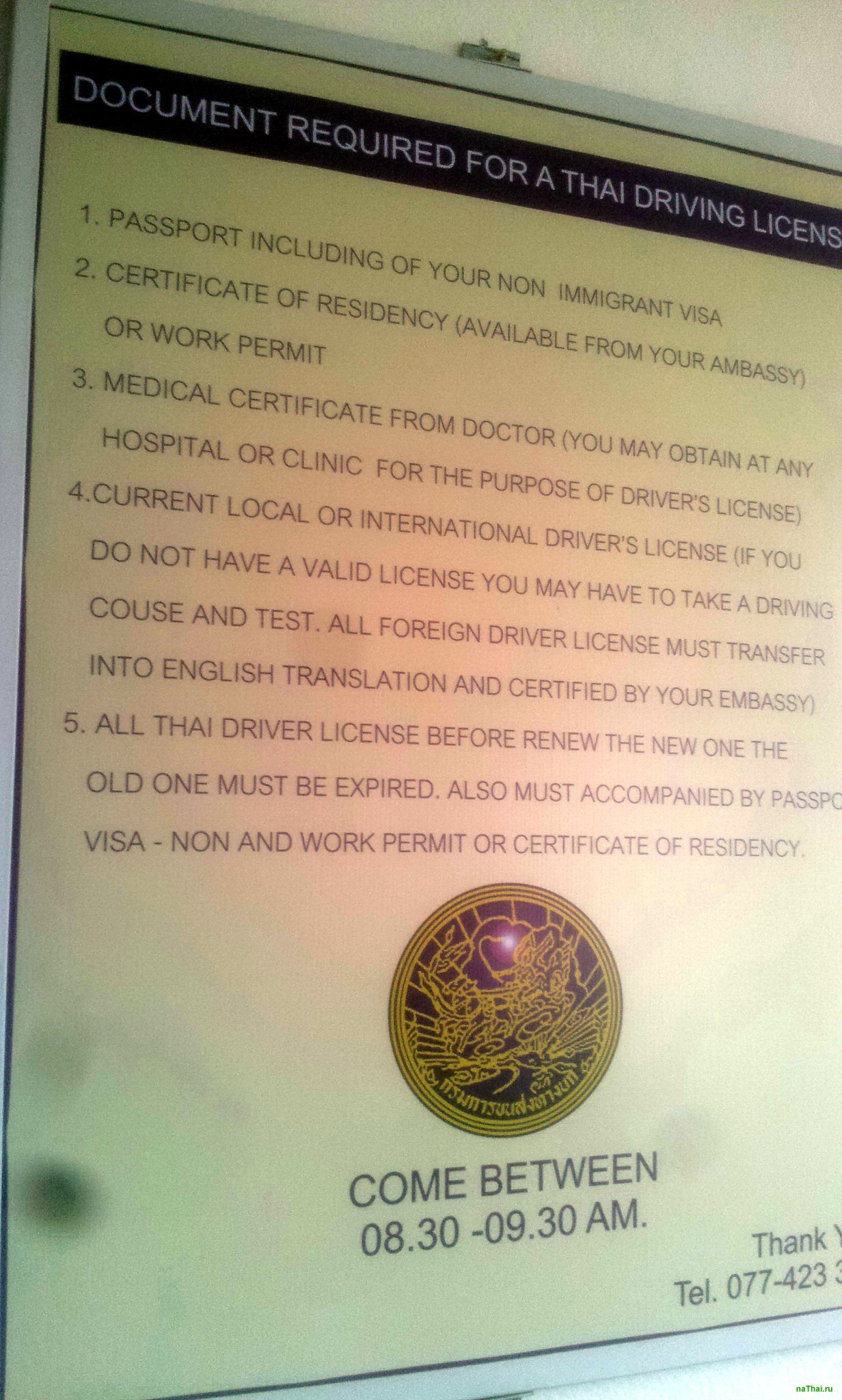 - Справка из Immigration Office (район Натон) для получения водительского удостоверения. Стоимость справки 500 бат. Просто приходите в имиграйшен офис и говорить мне нужна бумага для получения водительских прав (для тех кто в танке: ПЭйПЕР ФО ДРАЙВЕР ЛАЙЦЕНЗ). И тут два варианта - или у вас попросят адрес проживания (копию с адресной книги вашего арендатора) или прокатит по обычной визитке вашего дома или кондика. Насколько я знаю если вы живете в гостинице, то вам справку не дадут. Нужно именно жить в доме или снимать кондо. (upd: можно и в гостинице и отеле, просто показываете визитку и чек с оплатой). Так вот все зависит от того кто будет в тот момент принимать документы, если молодая девчонка, то при определенной симпатии, адрес она и с визитки возьмет, а если и симпатии нет, и не молодуха сидит то придется обращаться к своему арендатору и попросить копию адреса, для получения прав. Это все несложно, и обычно тайцы легко это дают. Проще простого снять в Натоне комнату в отеле за 250 бат в сутки и предъявить этот чек.