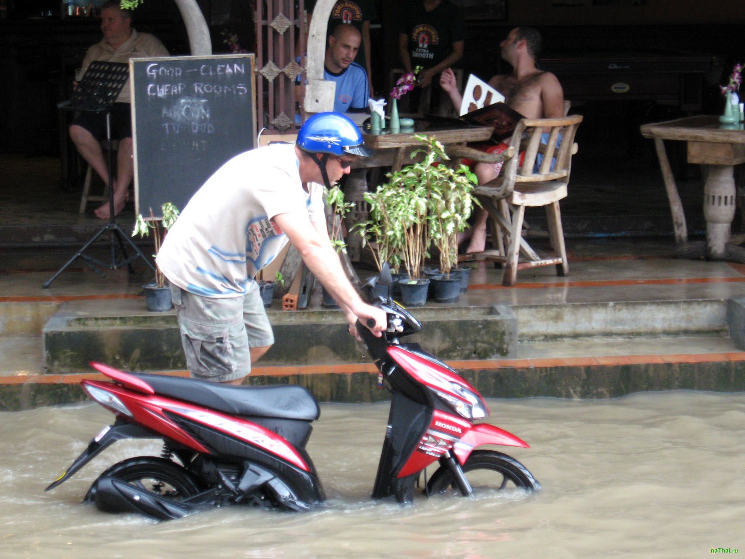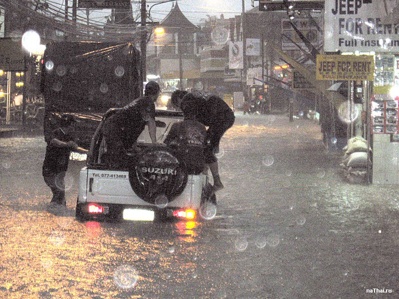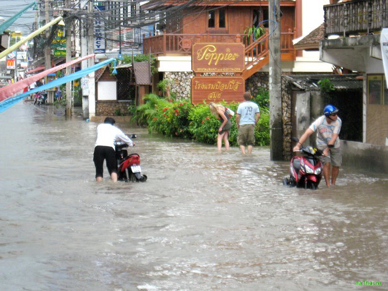 Как это происходит и когда? Ну во-первых сезон дождей ощущается не каждый год. Реальный сезон дождей, когда лило как из ведра две недели не прекращая и затопило Самуи - это было всего 2 раза за последние 10 лет (это было в 2007 и в 2011 годах). Тогда были перебои со светом, со свежей едой в магазинах, а в 2011 году даже перестали на неделю ходить паромы и летать самолеты. Было очень весело. У байков ломаются автоматы, машины встают в лужах. Камнепады на перевале в Ламай. В общем самое интересное с точки зрения интересности время.