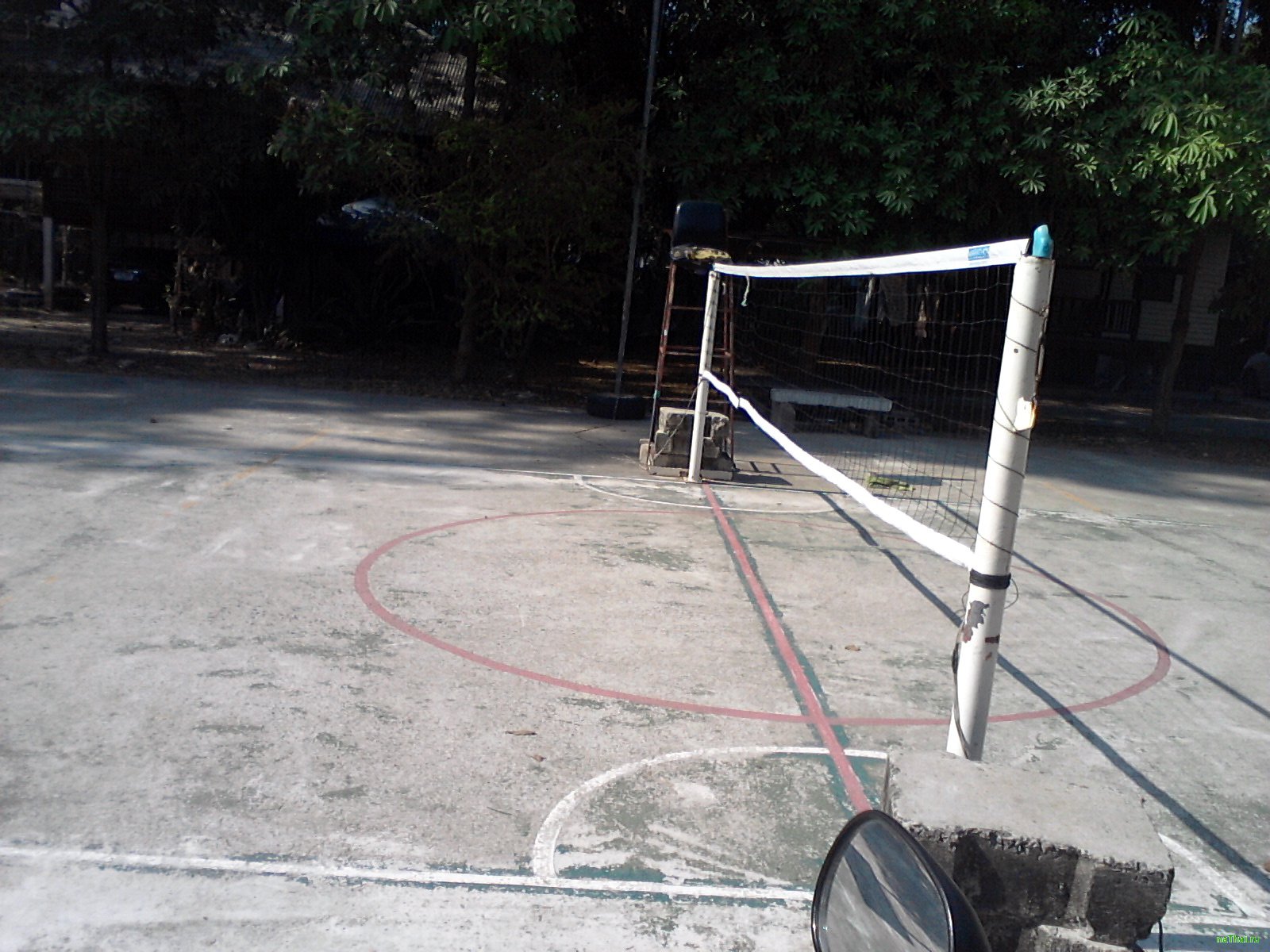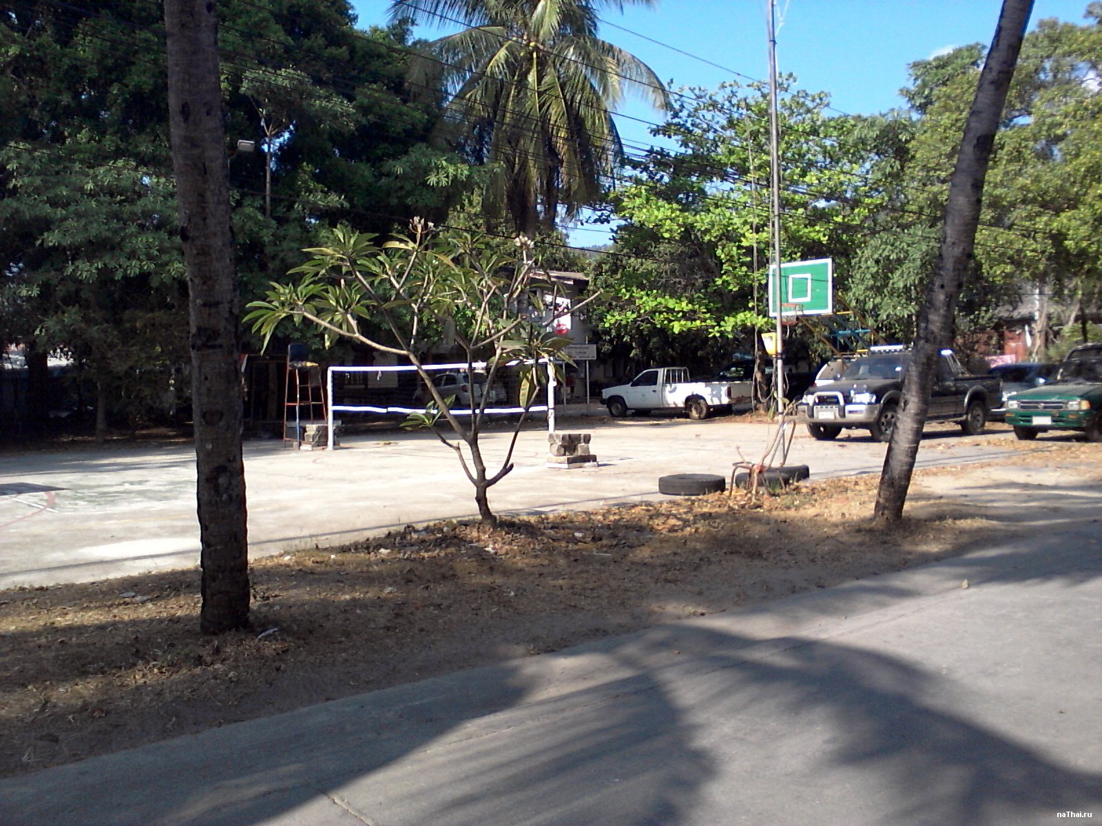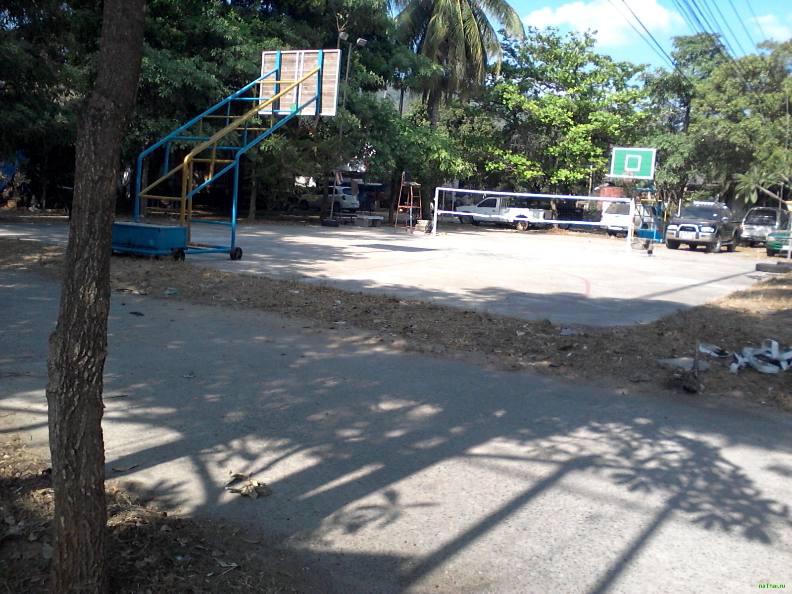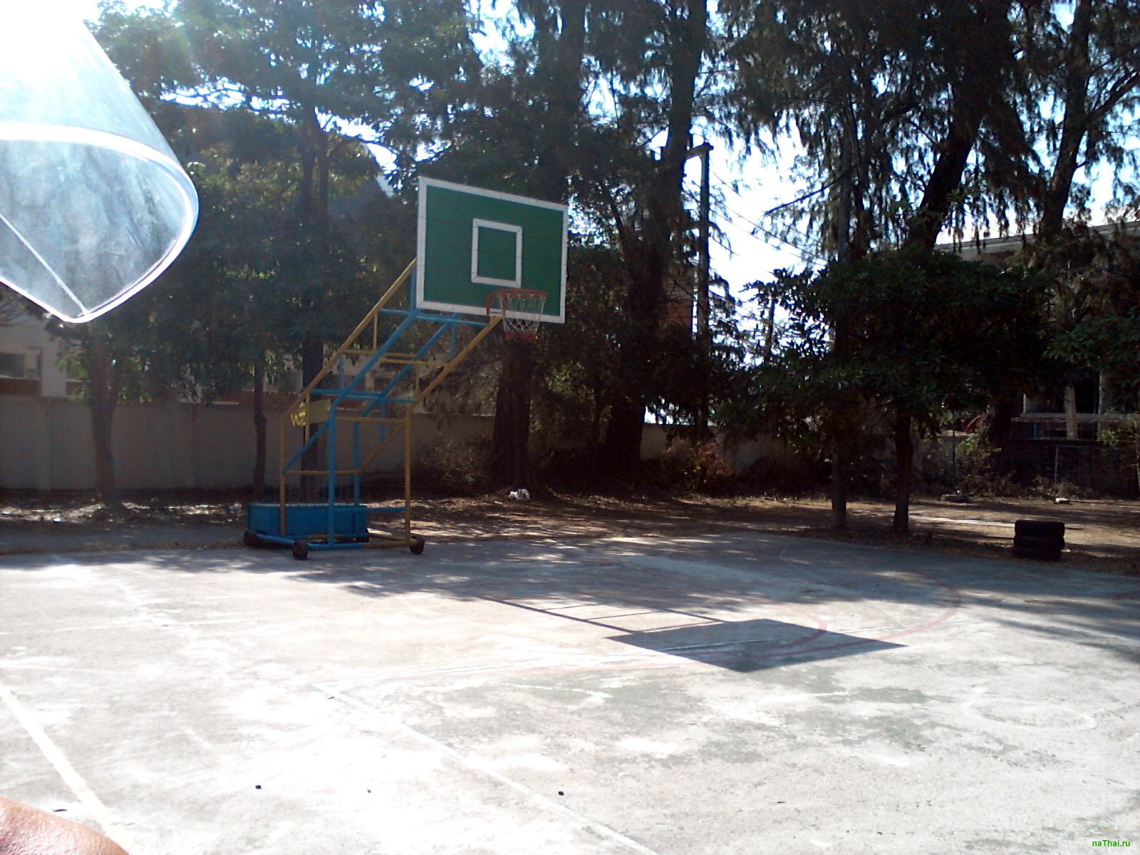 Открытая баскетбольная площадка, также есть натянутая волейбольная сетка. Приходи и играй.
